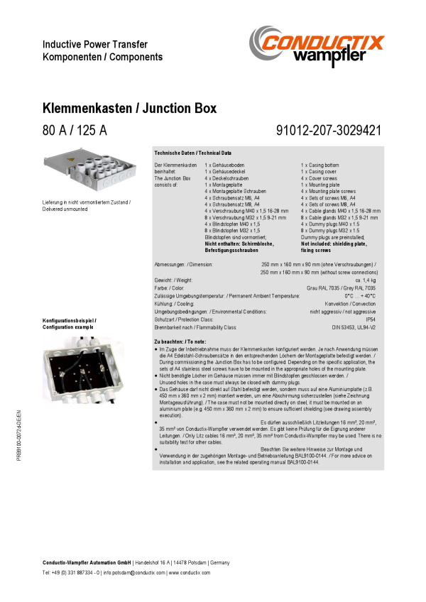 Klemmenkasten / Junction Box 80 A 125 A PDF | 271.05 KBLanguage: EnglishDocument type: Brochures Share Share this page on LinkedIn Share this page on Facebook Share this page on WeChat Share this page on X Share this page via mail Copy this page to clipboard Download