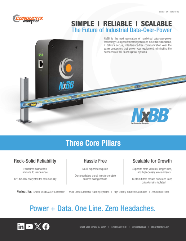 NxBB™是一种硬连线式的数据电力线传输系统,可通过现有的电源导线实现安全、高速的通信。它消除了无线或光纤系统中常见的干扰和不稳定性,确保为工业环境提供持续、可靠的连接。